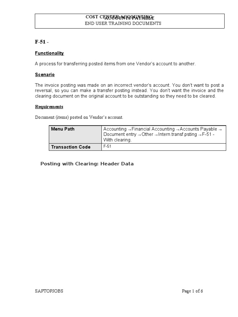 F-51 Functionality A process for transferring posted items from one Vendors account to another. Scenario The invoice posting was made on an incorrect vendors account. You dont want to post a reversal, so you can make a transfer posting instead. You dont want the invoice and the clearing document on the original account to be outstanding so they need to be cleared. Requirements Document (items) posted on Vendors account. Menu Path Accounting Financial Accounting Accounts Payable Document entry Other Intern.transf.psting F-51 With clearing.