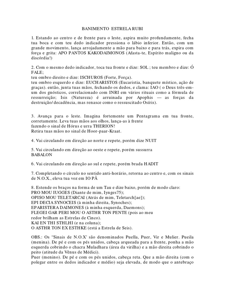 FALE; teu ombro direito e dize: ISCHUROS (Forte, Força). teu ombro esquerdo e dize: EUCHARISTOS (Eucaristia, banquete místico, ação de graças). então, junta tuas mãos, fechando os dedos, e clama: IAO ( o Deus três-em- um dos gnósticos, correlacionado com INRI em vários rituais como a fórmula de ressurreição; Isis (Natureza) é arruinada por Apophis — as forças da destruição/decadência, mas renasce como o ressuscitado Osíris).