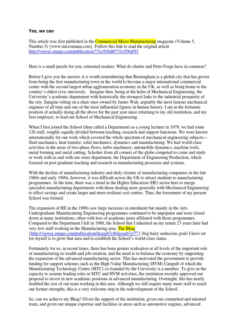 Here is a small puzzle for you, esteemed readers: What do chatter and Petro Forge have in common? Before I give you the answer, it is worth remembering that Birmingham is a global city that has grown from being the first manufacturing town in the world to become a major international commercial centre with the second largest urban agglomeration economy in the UK, as well as being home to the countrys oldest civic university. Imagine then, being at the helm of Mechanical Engineering, the Universitys academic department with historically the strongest links to the industrial prosperity of the city. Imagine sitting on a chair once owned by James Watt, arguably the most famous mechanical engineer of all time and one of the most influential figures in human history. I am in the fortunate position of actually doing all the above for the past year since returning to my old institution, and my first employer, to lead our School of Mechanical Engineering. When I first joined the School (then called a Department) as a young lecturer in 1979, we had some 120 staff, roughly equally divided between teaching, research and support functions. We were known internationally for our work which covered the whole spectrum of mechanical engineering subjects fluid mechanics, heat transfer, solid mechanics, dynamics and manufacturing. We had world-class activities in the areas of two-phase flows, turbo machinery, automobile dynamics, machine tools, metal forming and metal cutting. Scholars from all corners of the globe competed to come and study or work with us and with our sister department, the Department of Engineering Production, which focused on post-graduate teaching and research in manufacturing processes and systems. With the decline of manufacturing industry and daily closure of manufacturing companies in the late 1980s and early 1990s, however, it was difficult across the UK to attract students to manufacturing programmes. At the time, there was a trend in the Higher Education (HE) sector here to merge specialist manufacturing departments with those dealing more generally with Mechanical Engineering to effect savings and create larger and more resilient cost centres. Thus, the forerunner of my present School was formed. The expansion of HE in the 1990s saw large increases in enrolment but mainly in the Arts. Undergraduate Manufacturing Engineering programmes continued to be unpopular and were closed down at many institutions, often with loss of academic posts affiliated with those programmes. Compared to the Department I left in 1988, the School that I inherited on my return 23 years later had very few staff working in the Manufacturing area. The Bhag {[Link] (big hairy audacious goal) I have set for myself is to grow that area and re-establish the Schools world-class status. Fortunately for us, in recent times, there has been greater realisation at all levels of the important role of manufacturing in wealth and job creation, and the need to re-balance the economy by supporting the expansion of the advanced manufacturing sector. This has motivated the government to provide funding for support schemes such as the High-Value Manufacturing (HVM) Catapult of which the Manufacturing Technology Centre (MTC) co-founded by the University is a member. To give us the capacity to assume leading roles in MTC and HVM activities, the institution recently approved our proposal to invest in new academic positions in advanced manufacturing. Overnight, this has nearly doubled the size of our team working in this area. Although we still require many more staff to reach our former strengths, this is a very welcome step in the redevelopment of the School. So, can we achieve my Bhag? Given the support of the institution, given our committed and talented team, and given our unique expertise and facilities in areas such as automotive engines, advanced