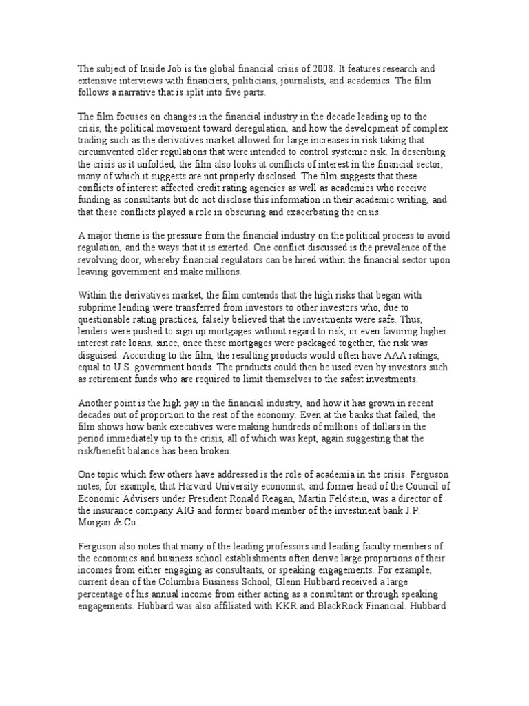 It features research and extensive interviews with financiers, politicians, journalists, and academics. The film follows a narrative that is split into five parts. The film focuses on changes in the financial industry in the decade leading up to the crisis, the political movement toward deregulation, and how the development of complex trading such as the derivatives market allowed for large increases in risk taking that circumvented older regulations that were intended to control systemic risk. In describing the crisis as it unfolded, the film also looks at conflicts of interest in the financial sector, many of which it suggests are not properly disclosed. The film suggests that these conflicts of interest affected credit rating agencies as well as academics who receive funding as consultants but do not disclose this information in their academic writing, and that these conflicts played a role in obscuring and exacerbating the crisis. A major theme is the pressure from the financial industry on the political process to avoid regulation, and the ways that it is exerted. One conflict discussed is the prevalence of the revolving door, whereby financial regulators can be hired within the financial sector upon leaving government and make millions. Within the derivatives market, the film contends that the high risks that began with subprime lending were transferred from investors to other investors who, due to questionable rating practices, falsely believed that the investments were safe. Thus, lenders were pushed to sign up mortgages without regard to risk, or even favoring higher interest rate loans, since, once these mortgages were packaged together, the risk was disguised. According to the film, the resulting products would often have AAA ratings, equal to U.S. government bonds. The products could then be used even by investors such as retirement funds who are required to limit themselves to the safest investments. Another point is the high pay in the financial industry, and how it has grown in recent decades out of proportion to the rest of the economy. Even at the banks that failed, the film shows how bank executives were making hundreds of millions of dollars in the period immediately up to the crisis, all of which was kept, again suggesting that the risk/benefit balance has been broken. One topic which few others have addressed is the role of academia in the crisis. Ferguson notes, for example, that Harvard University economist, and former head of the Council of Economic Advisers under President Ronald Reagan, Martin Feldstein, was a director of the insurance company AIG and former board member of the investment bank J.P. Morgan & Co.. Ferguson also notes that many of the leading professors and leading faculty members of the economics and business school establishments often derive large proportions of their incomes from either engaging as consultants, or speaking engagements. For example, current dean of the Columbia Business School, Glenn Hubbard received a large percentage of his annual income from either acting as a consultant or through speaking engagements. Hubbard was also affiliated with KKR and BlackRock Financial. Hubbard