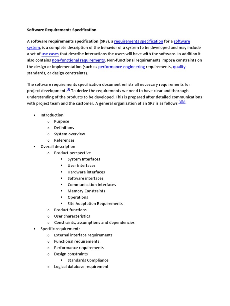 Introduction o Purpose o Definitions o System overview o References Overall description o Product perspective System Interfaces User Interfaces Hardware interfaces Software interfaces Communication Interfaces Memory Constraints Operations Site Adaptation Requirements o Product functions o User characteristics o Constraints, assumptions and dependencies Specific requirements o External interface requirements o Functional requirements o Performance requirements o Design constraints Standards Compliance o Logical database requirement
