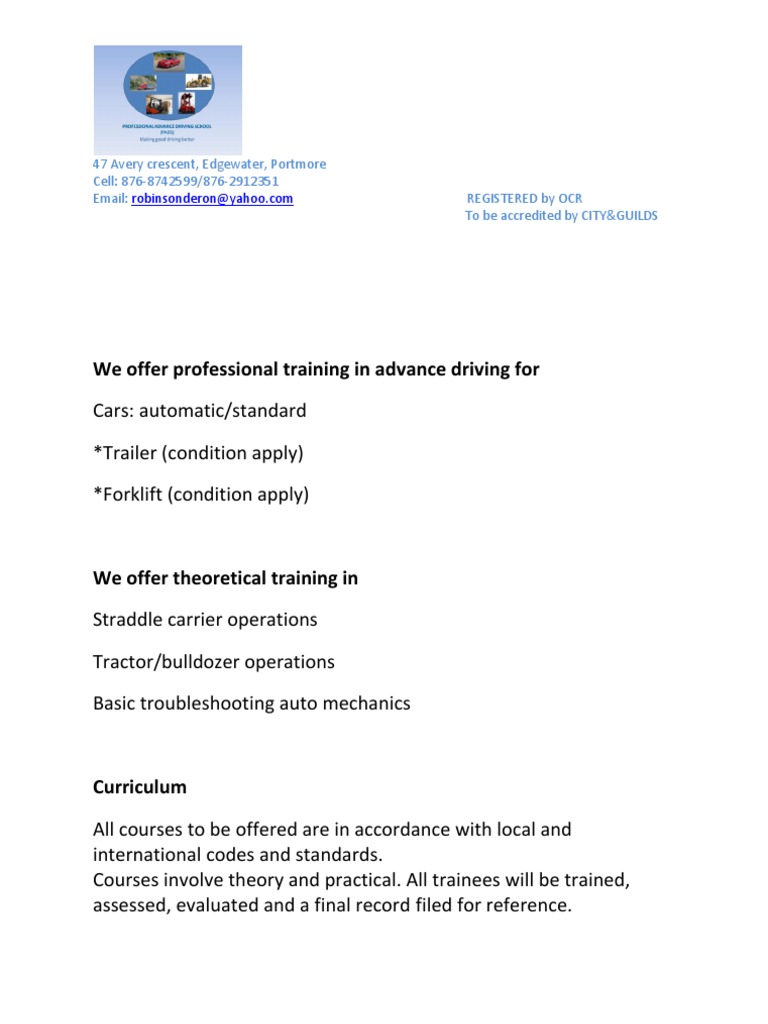 47 Avery crescent, Edgewater, Portmore Cell: 876-8742599/876-2912351 Email: robinsonderon@yahoo.