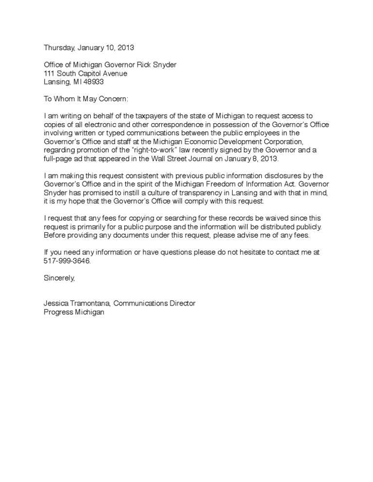 A letter sent from Progress Michigan to Gov. Snyder's office on January 10, 2013.