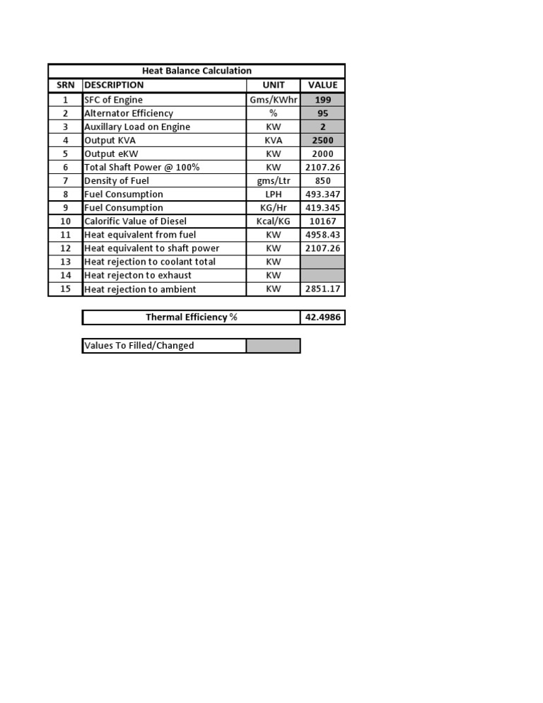 KVA KVA 5 Output eKW KW 6 Total Shaft Power @ 100% KW 7 Density of Fuel gms/Ltr 8 Fuel Consumption LPH 9 Fuel Consumption KG/Hr 10 Calorific Value of Diesel Kcal/KG 11 Heat equivalent from fuel KW 12 Heat equivalent to shaft power KW 13 Heat rejection to coolant total KW 14 Heat rejecton to exhaust KW 15 Heat rejection to ambient KW Thermal Efficiency % Values To Filled/Changed