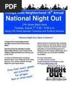 Ven a conocer a tus vecinos y amigos y disfruta de una tarde llena de alegra, habr comida mexicana de Qdoba. Recursos para los vecinos. Invitados especiales incluye a: La nueva jefe de Polica de la Ciudad de Minneapolis Janee Harteau, el nuevo comandante del 3 precinto Michael Sullivan y el Vicepresidente del Concilio de la Ciudad Robert Lilligren! Si tienes preguntas, deseas ayudar o tener una mesa de informacin, por favor llmanos a la oficina del barrio de Phillips West al telfono 612-879-5389 o contctanos en: pwno2005@yahoo.com