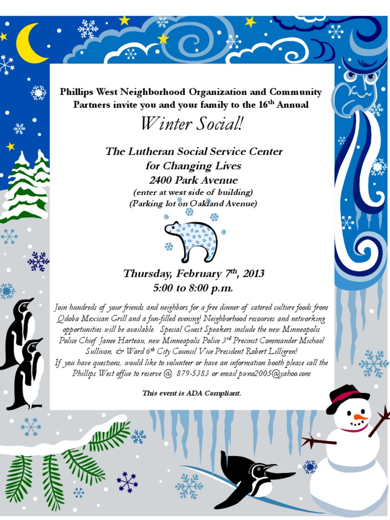 Kala qayb gal boqolaal saaxiibadaa iyo dariskaaga ah xaflad aad ka heli karto cunto dhaqameed lacag laaan ah iyo waliba madadaalo! Waxaad kaloo heli doontaa macluumaad ku saabsan xaafada waxaadna heli doontaa fursad aad kula kulanto asxaab iyo daris aadan horay u aqoon. Marti sharafta xafladda ka hadli doonta waxaa ka mid ah Madaxa Waaxda Bilayska Minneapolis Chief Janee Harteau, madaxa cusub ee laanta 3aad ee Bilayska Minneapolis Commander Michael Sullivan iyo Robert Lilligren, ku xigeenka guddiga Magaalada Minneapolis isla markaasna ah wakiilka Qaybta 6aad ee guddiga magaalada! Haddii aad wax suaal qabto, aad rabto inaad caawiso xafladda ama aad miis dhigato xafladda, fadlan wac xafiiska Phillips West taleefonka @ 879-5383 or emailka pwno2005@yahoo.com