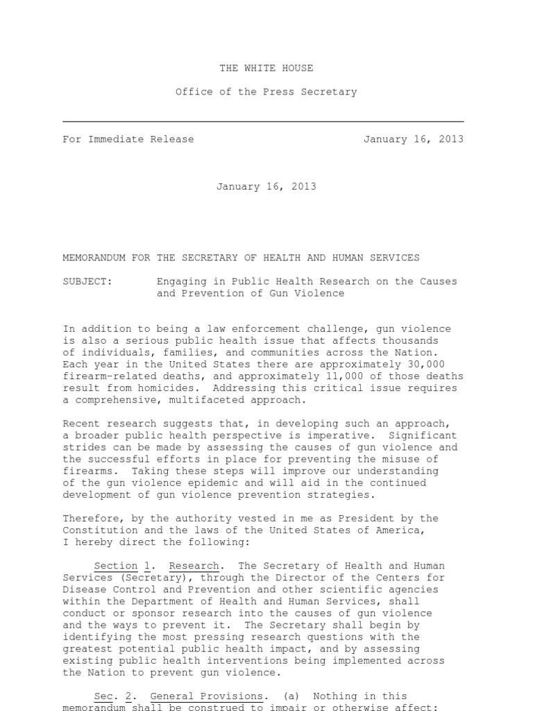 A memorandum from the President for the Secretary of Health and Human Services regarding engaging in public health research on the causes and prevention of gun violence.