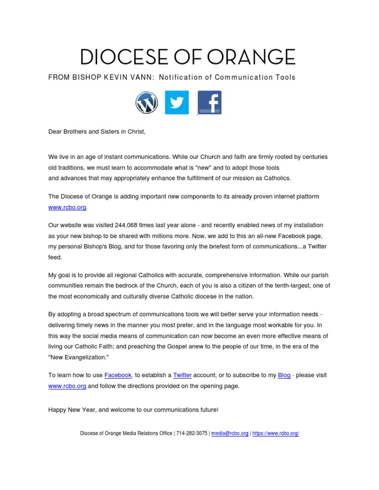 We live in an age of in nstant commu unications. While our Chur and faith are firmly roo W rch oted by centur ries tions, we mus learn to acc st commodate what is "new" and to adopt those tools w old tradit and adva ances that ma appropriat ay tely enhance the fulfillment of our missio as Catholics. t t on The Dioc cese of Orang is adding important new components to its alread proven inte ge w s dy ernet platform m [Link] [Link]. Our web bsite was visit 244,068 ti ted imes last year alone - and recently enab bled news of my installatio on as your new bishop to be shared with millions more. Now, w add to this an all-new Fa o w m we acebook page e, onal Bishop's Blog, and for those favoring only the b s briefest form o communica of ations...a Twit tter my perso feed. My goal is to provide all regional Catholics with accurate, com C mprehensive information. While our parish nities remain the bedrock of the Church, each of you is also a citiz of the tenth-largest, on of t o zen ne commun the most economically and culturally diverse Ca t atholic dioces in the natio se on. By adopting a broad spectrum of communicatio tools we w better serv your inform s c ons will ve mation needs deliverin timely news in the mann you most prefer, and in the language most worka ng s ner n able for you. In this way the social me edia means of communica o ation can now become an e w even more eff fective means of s ching the Gos spel anew to t people of our time, in t era of the the f the living our Catholic Faith; and preac vangelization." "New Ev To learn how to use Facebook, to establish a Tw F witter accoun or to subsc nt, cribe to my Blog - please v visit [Link] and follow the direct tions provided on the open d ning page. [Link]