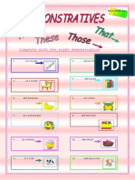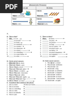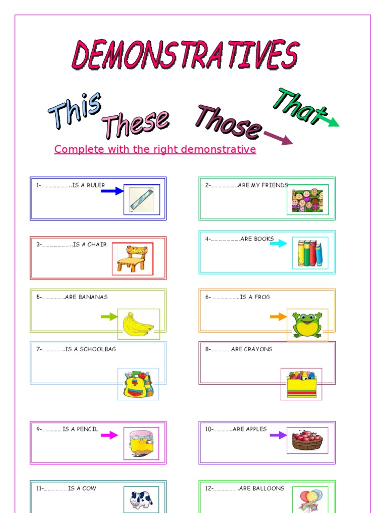 This document contains 30 fill-in-the-blank sentences describing various singular and plural nouns using demonstrative pronouns like "this", "these", "that", or "those". The nouns include objects, places, people, fruits and vegetables, school supplies, animals, clothing, and transportation.