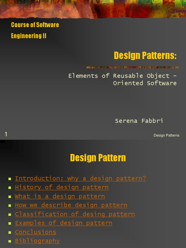 Introduction: why a design pattern? History of design pattern What is a design pattern How we describe design pattern Classification of desing pattern Examples of design pattern Conclusions Bibliography