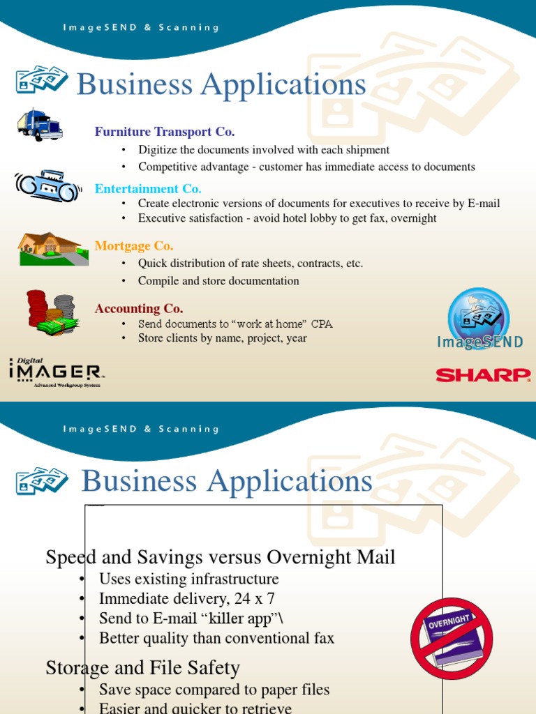 Uses existing infrastructure Immediate delivery, 24 x 7 Send to E-mail killer app\ Better quality than conventional fax