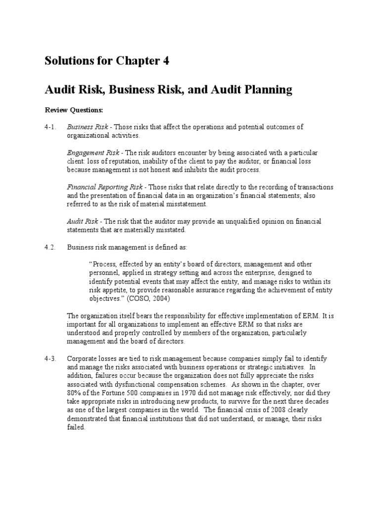 Review Questions: 4-1. Business Risk - Those risks that affect the operations and potential outcomes of organizational activities. Engagement Risk - The risk auditors encounter by being associated with a particular client: loss of reputation, inability of the client to pay the auditor, or financial loss because management is not honest and inhibits the audit process. Financial Reporting Risk - Those risks that relate directly to the recording of transactions and the presentation of financial data in an organizations financial statements; also referred to as the risk of material misstatement. Audit Risk - The risk that the auditor may provide an unqualified opinion on financial statements that are materially misstated. 4.2. Business risk management is defined as: Process, effected by an entitys board of directors, management and other personnel, applied in strategy setting and across the enterprise, designed to identify potential events that may affect the entity, and manage risks to within its risk appetite, to provide reasonable assurance regarding the achievement of entity objectives. (COSO, 2004) The organization itself bears the responsibility for effective implementation of ERM. It is important for all organizations to implement an effective ERM so that risks are understood and properly controlled by members of the organization, particularly management and the board of directors. 4-3. Corporate losses are tied to risk management because companies simply fail to identify and manage the risks associated with business operations or strategic initiatives. In addition, failures occur because the organization does not fully appreciate the risks associated with dysfunctional compensation schemes. As shown in the chapter, over 80% of the Fortune 500 companies in 1970 did not manage risk effectively, nor did they take appropriate risks in introducing new products, to survive for the next three decades as one of the largest companies in the world. The financial crisis of 2008 clearly demonstrated that financial institutions that did not understand, or manage, their risks failed.
