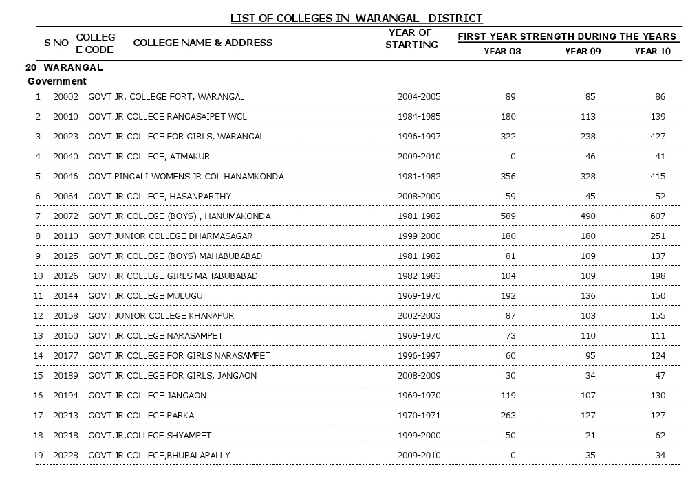 LIST OF COLLEGES IN WARANGAL DISTRICT