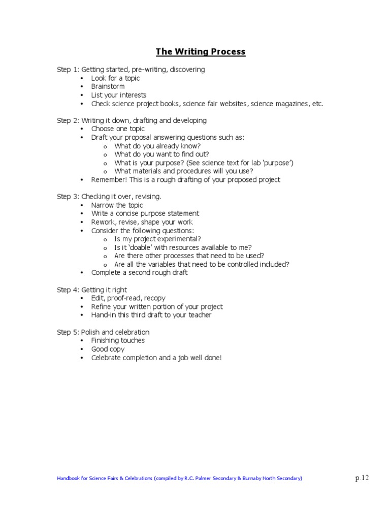 Step 1: Getting started, pre-writing, discovering Look for a topic Brainstorm List your interests Check science project books, science fair websites, science magazines, etc. Step 2: Writing it down, drafting and developing Choose one topic Draft your proposal answering questions such as: o What do you already know? o What do you want to find out? o What is your purpose? (See science text for lab purpose) o What materials and procedures will you use? Remember! This is a rough drafting of your proposed project Step 3: Checking it over, revising. Narrow the topic Write a concise purpose statement Rework, revise, shape your work Consider the following questions: o Is my project experimental? o Is it doable with resources available to me? o Are there other processes that need to be used? o Are all the variables that need to be controlled included? Complete a second rough draft Step 4: Getting it right Edit, proof-read, recopy Refine your written portion of your project Hand-in this third draft to your teacher Step 5: Polish and celebration Finishing touches Good copy Celebrate completion and a job well done!