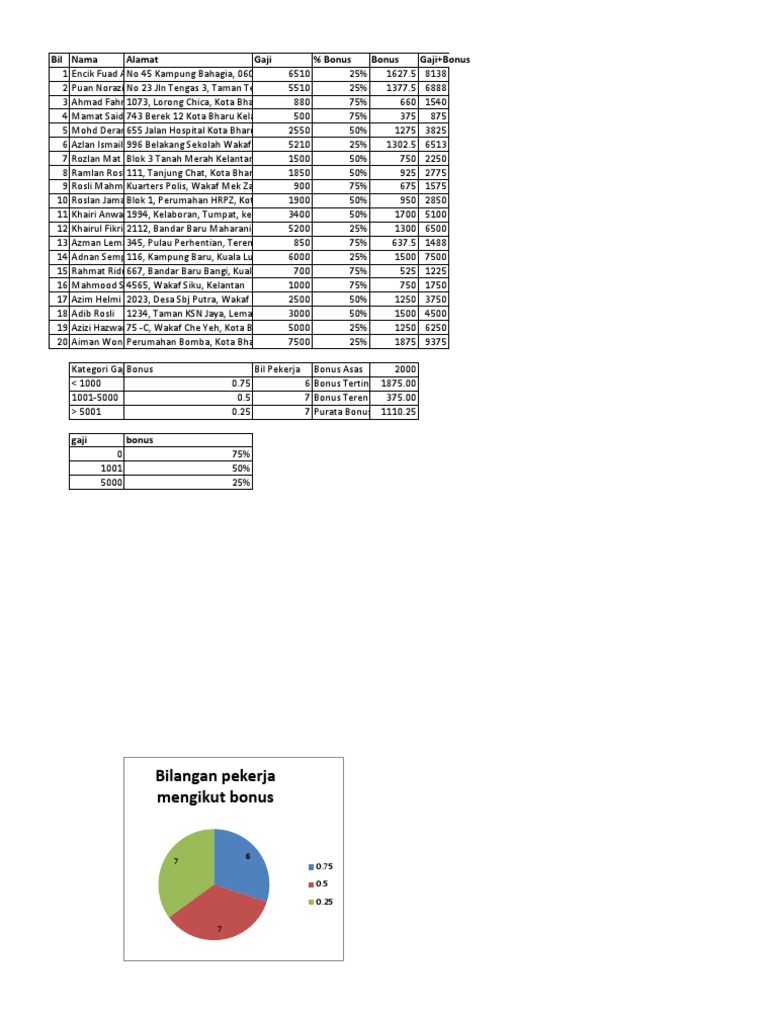 Nama Alamat Gaji % Bonus Bonus Gaji+Bonus Encik Fuad Azman Kampung Bahagia, 06010, Jitra6510 No 45 Kedah 25% 1627.5 8138 Puan Noraziah Harun Tengas 3, Taman Tengas, 06010 Changlun25% No 23 Jln 5510 1377.5 6888 Ahmad Fahmi 1073, Lorong Chica, Kota Bharu Kelantan 880 75% 660 1540 Mamat Saidin43 Berek 12 Kota Bharu Kelantan 7 500 75% 375 875 Mohd Deraman Jalan Hospital Kota Bharu, Kelantan 655 2550 50% 1275 3825 Azlan Ismail 996 Belakang Sekolah Wakaf Bharu, Kelantan 5210 25% 1302.5 6513 Rozlan Mat Blok 3 Tanah Merah Kelantan 1500 50% 750 2250 Ramlan Roslan Tanjung Chat, Kota Bharu, Kelantan 111, 1850 50% 925 2775 Rosli Mahmood Kuarters Polis, Wakaf Mek Zainab, Kelantan 900 75% 675 1575 Roslan Jamaludin 1, Perumahan HRPZ, Kota Bharu,1900 Blok Kelantan 50% 950 2850 Khairi Anwari 994, Kelaboran, Tumpat, kelantan 3400 1 50% 1700 5100 Khairul Fikri 2112, Bandar Baru Maharani, Johor. 5200 25% 1300 6500 Azman Leman45, Pulau Perhentian, Terengganu 850 3 75% 637.5 1488 Adnan Sempit Kampung Baru, Kuala Lumpur 6000 116, 25% 1500 7500 Rahmat Riduwan Bandar Baru Bangi, Kuala Lumpur700 667, 75% 525 1225 Mahmood SelamatWakaf Siku, Kelantan 4565, 1000 75% 750 1750 Azim Helmi 2023, Desa Sbj Putra, Wakaf Bharu, Kelantan 2500 50% 1250 3750 Adib Rosli 1234, Taman KSN Jaya, Lemau, Pasir Mas, Kelantan 50% 3000 1500 4500 Azizi Hazwan75 -C, Wakaf Che Yeh, Kota Bharu, Kelantan 5000 25% 1250 6250 Aiman WongPerumahan Bomba, Kota Bharu, Kelantan 7500 25% 1875 9375 Kategori GajiBonus < 1000 1001-5000 > 5001 gaji 0 1001 5000 bonus 75% 50% 25% Bil Pekerja 0.75 0.5 0.25 Bonus Asas 2000 6 Bonus Tertinggi1875.00 7 Bonus Terendah 375.00 7 Purata Bonus 1110.25