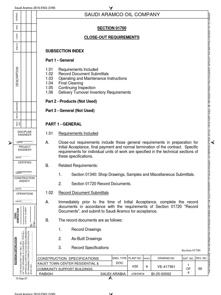 Record Document Submittals Immediately prior to the time of Initial Acceptance, complete the record documents in accordance with the requirements of Section 01720 "Record Documents", and submit to Saudi Aramco for acceptance. The record documents are as follows: 1. 2. 3. Record Drawings As-Built Drawings Record Specifications