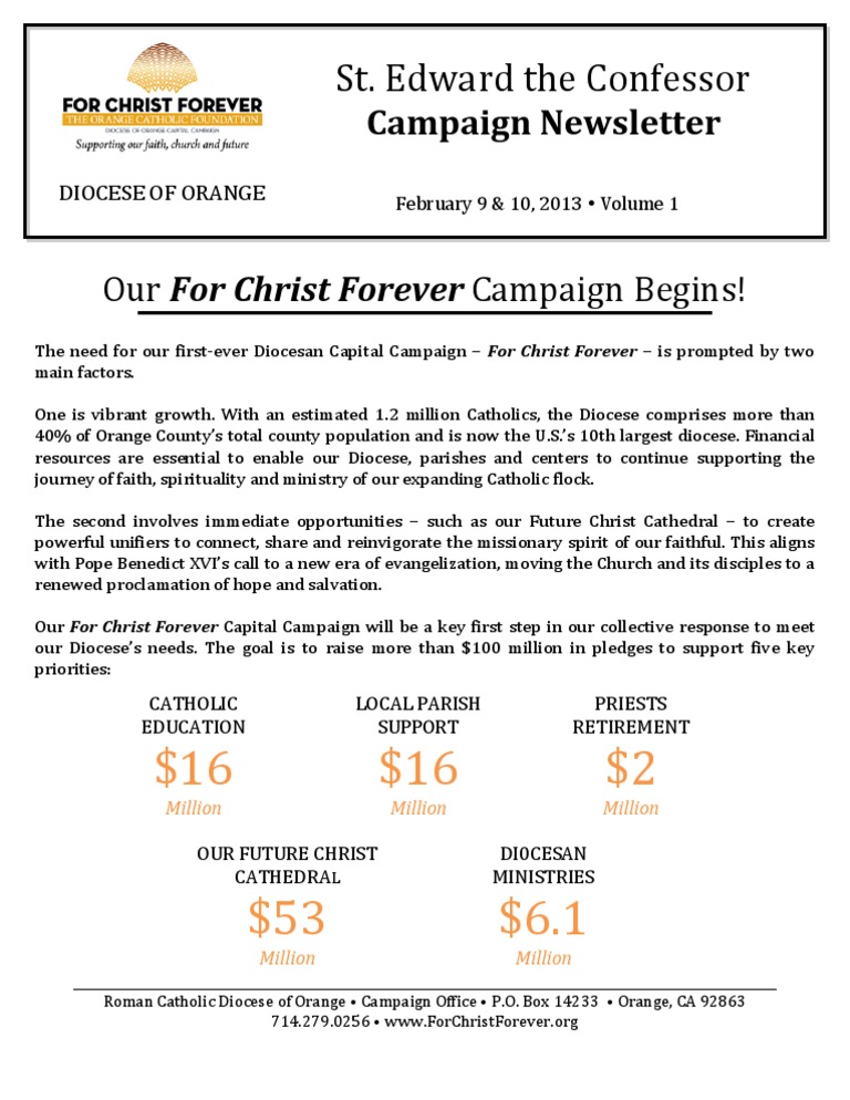 One is vibrant growth. With an estimated 1.2 million Catholics, the Diocese comprises more than 40% of Orange Countys total county population and is now the U.S.s 10th largest diocese. Financial resources are essential to enable our Diocese, parishes and centers to continue supporting the journey of faith, spirituality and ministry of our expanding Catholic flock. The second involves immediate opportunities such as our Future Christ Cathedral to create powerful unifiers to connect, share and reinvigorate the missionary spirit of our faithful. This aligns with Pope Benedict XVIs call to a new era of evangelization, moving the Church and its disciples to a renewed proclamation of hope and salvation. Our For Christ Forever Capital Campaign will be a key first step in our collective response to meet our Dioceses needs. The goal is to raise more than $100 million in pledges to support five key priorities: