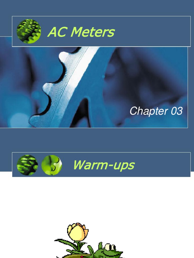 No 1 2 3 4 5 Meter Movement Electrodynamometer Iron-Vane Electro-static Thermocouple DArsonval DC Use YES YES YES YES YES AC Use YES YES YES YES Applications Standard meter, Wattmeter, etc Indicator applications, etc High voltage measurement. Radio freq measurement
