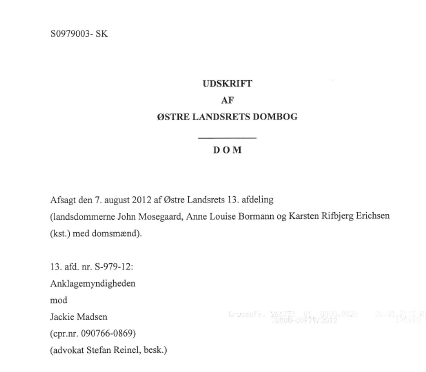 Denmark: Eastern High Court Prosecutor v. Jackie Madsen,7 August 2012