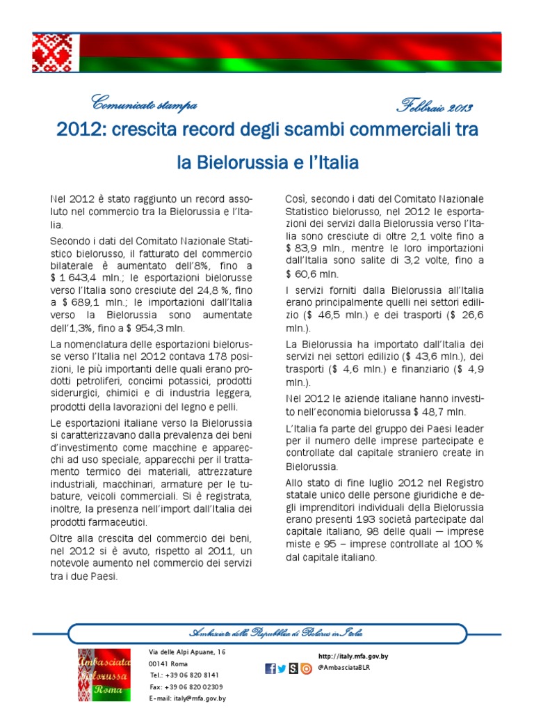 4 views1 pageComunicato stampa: 2012: crescita record degli scambi commerciali tra Febbraio 2013 la Bielorussia e l’Italia