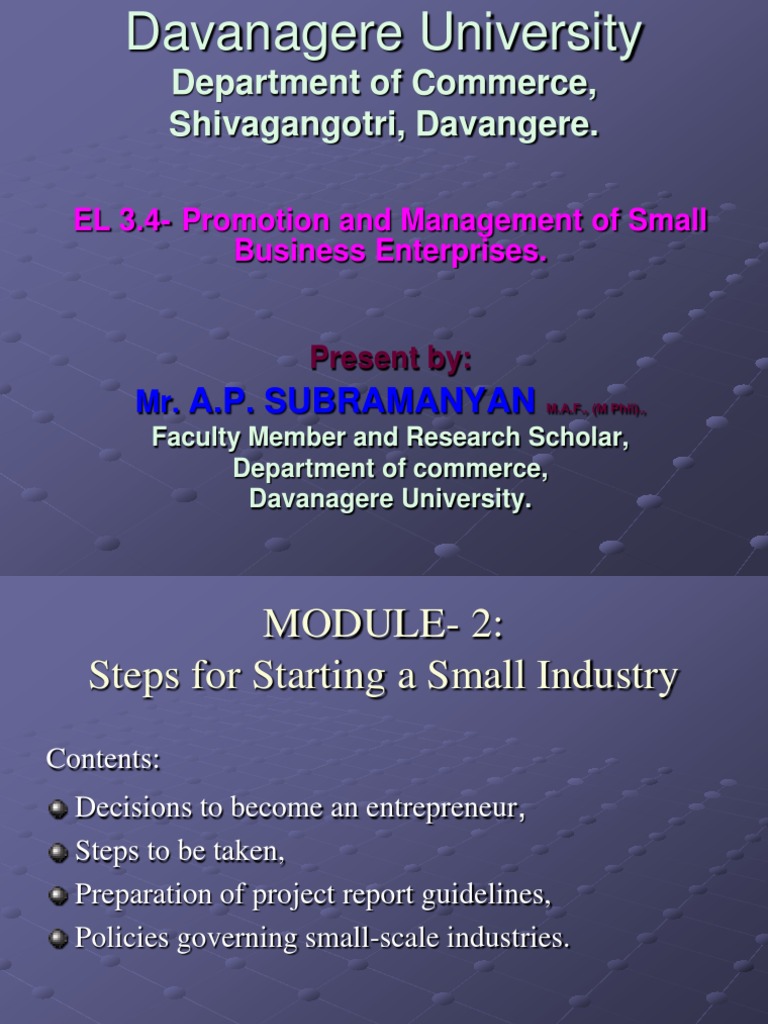 Decisions to become an entrepreneur, Steps to be taken, Preparation of project report guidelines, Policies governing small-scale industries.