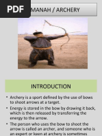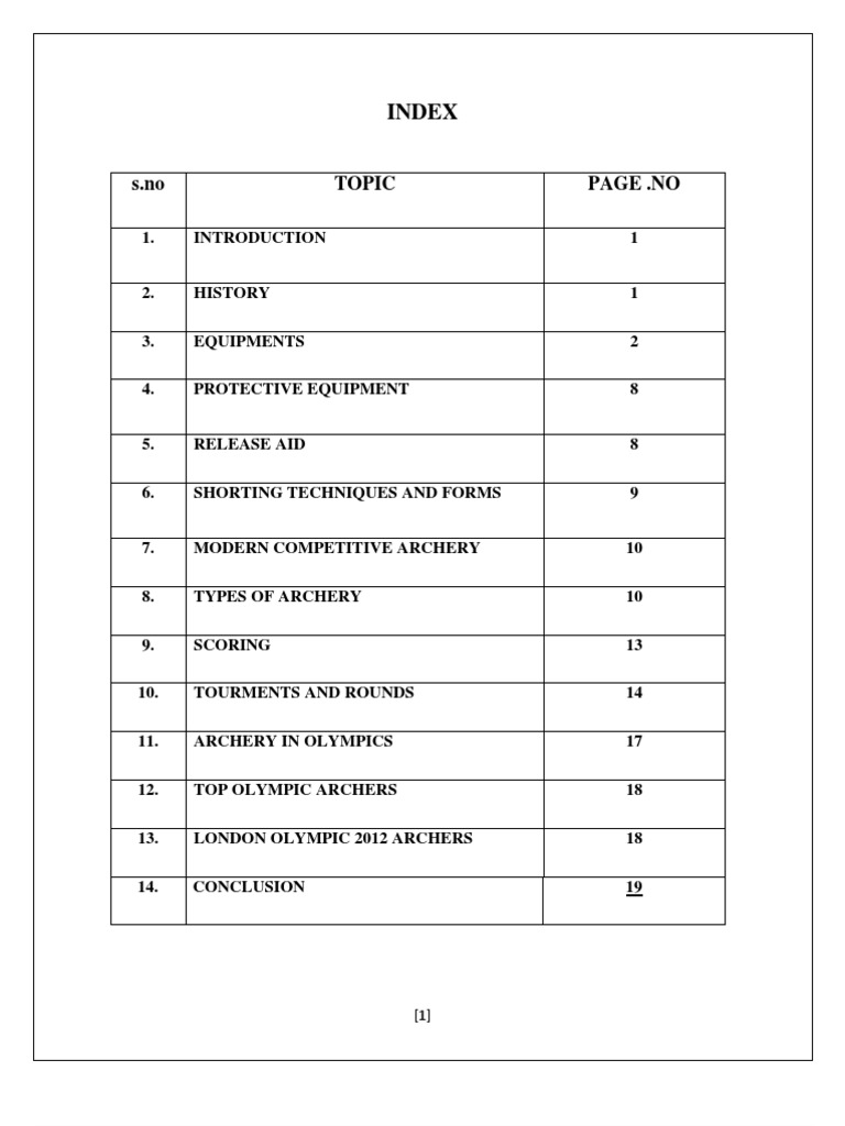 1. 2. 3. 4. 5. 6. 7. 8. 9. 10. 11. 12. 13. 14. INTRODUCTION HISTORY EQUIPMENTS PROTECTIVE EQUIPMENT RELEASE AID SHORTING TECHNIQUES AND FORMS MODERN COMPETITIVE ARCHERY TYPES OF ARCHERY SCORING TOURMENTS AND ROUNDS ARCHERY IN OLYMPICS TOP OLYMPIC ARCHERS LONDON OLYMPIC 2012 ARCHERS CONCLUSION