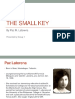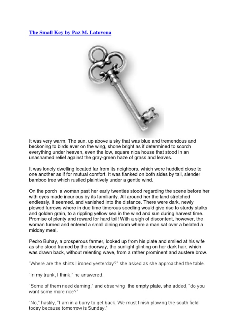Pedro pushed the chair back and stood up. Soledad began to pile the dirty dishes one on top of the other. Here is the key to my trunk. From the pocket of his khaki coat he pulled a string of non descript red which held together a big shiny key and another small, rather rusty looking one. With deliberate care he untied the knot and, detaching the big key, dropped the small one back into his pocket. She watched him fixedly as he did this. The smile left her face and a strange look came into her eyes as she took the big key from him without a word. Together they left the dining room. Out of the porch he put an arm around her shoulders and peered into her shadowed face. You look pale and tired, he remarked softly. What have you been doing all morning? Nothing, she said listlessly. But the heat gives me a headache. Then lie down and try to sleep while I am gone. For a moment they looked deep into each others eyes. It is really warm, he continued. I think I will take off my coat. He removed the garment absent mindedly and handed it to her. The stairs creaked under his weight as he went down. Choleng, he turned his head as he opened the gate, I shall pass by Tia Marias house and tell her to come. I may not return before dark. Soledad nodded. Her eyes followed her husband down the road, noting the fine set of his head and shoulders, the case of his stride. A strange ache rose in her throat. She looked at the coat he had handed to her. It exuded a faint smell of his favorite cigars, one of which he invariably smoked, after the days work, on his way home from the fields. Mechanically, she began to fold the garment. As she was doing so, s small object fell from the floor with a dull, metallic sound. Soledad stooped down to pick it up. It was the small key! She stared at it in her palm as if she had never seen it before. Her mouth was tightly drawn and for a while she looked almost old. She passed into the small bedroom and tossed the coat carelessly on the back of a chair. She opened the window and the early afternoon sunshine flooded in. On a mat spread on the bamboo floor were some newly washed garments. She began to fold them one by one in feverish haste, as if seeking in the task of the moment in refuge from painful thoughts. But her eyes moved restlessly around the