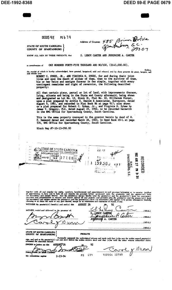 485 Brian Drive, Spartanburg, South Carolina 29307. August 1992. Deed to Virginia H Sykes (aka Virginia H. Davidson) and Robert C Skyes, Jr.