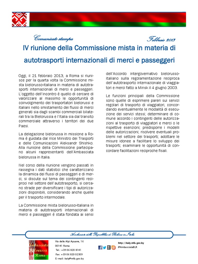 21 febbraio 2013 a Roma si riunisce per la quarta volta la Commissione mista bielorusso-italiana in materia di autotrasporti internazionali di merci e passeggeri