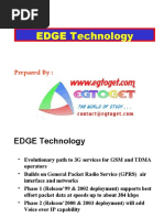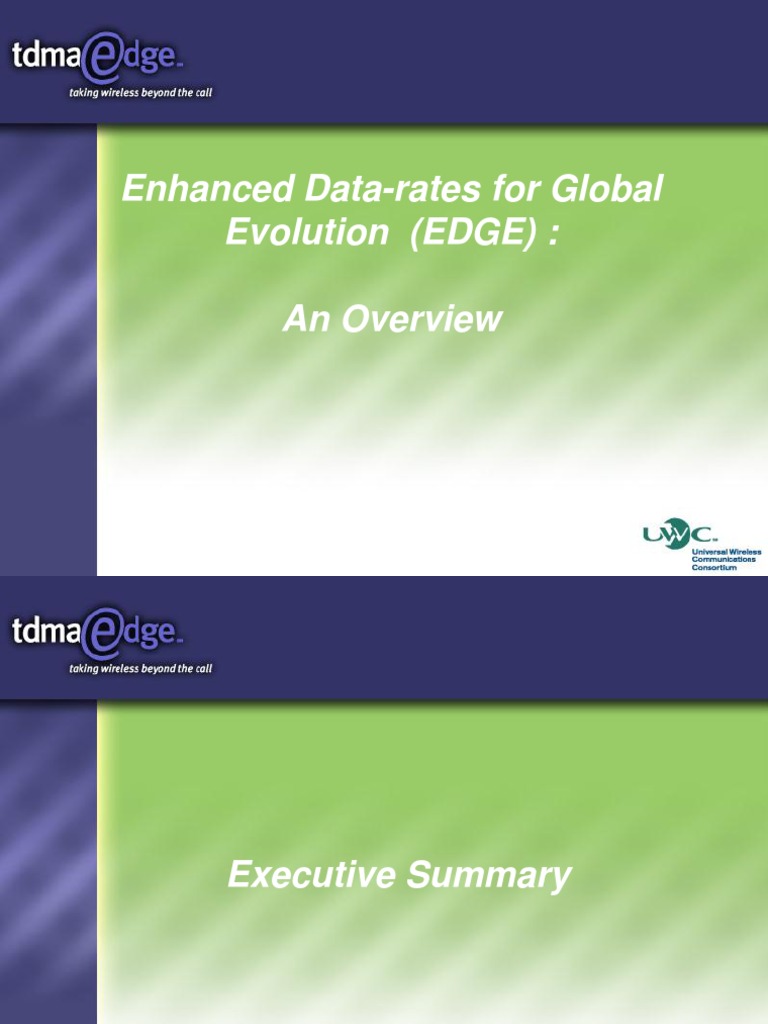 EDGE is a 3G technology offering a common migration path and convergence for GSM and TDMA operators EDGE Compact can be deployed with < 2x 1 MHz of spectrum EDGE supports IP packet data at peak rates > 384 kbps Voice over IP is planned for EDGE R2000 standards