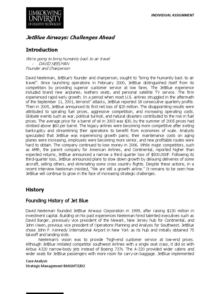 JetBlue delivers this service by offering additional preflight and on-board conveniences that other low-cost carriers do not provide as a whole package. Before traveling, customers benefit Case Analysis Strategic Management BMGMT3202
