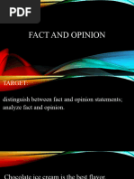 Fact or Opinion 15. Heart disease is the leading cause of death in America. 2. The chicken sandwiches are more expensive than double cheeseburgers Fact or Opinion 3. Skateboarding on public property is against the law. Fact or Opinion Fact or Opinion 17. Burning the American flag should be a crime. 4. Copying homework assignments is wrong. Fact or Opinion Fact or Opinion 18. There are more cell phones in Japan than people. 5. Students who are caught cheating in college can be kicked out of the university without a refund. Fact or Opinion 6. Sometimes curly hair can look better than straight hair. Fact or Opinion Fact or Opinion 7. Each year more people are taken to the hospital for injuries while playing football than basketball. Fact or Opinion 21. Playing video games is more fun than doing homework. 8. Justin Bieber is a very talented entertainer. Fact or Opinion Fact or Opinion 9. Cursing in school is inappropriate behavior. Fact or Opinion 10. The Sony Playstation 2 is the best selling video game console of all time. Fact or Opinion 11. It is worth sacrificing some personal liberties to protect our country from terrorism. Fact or Opinion 12. The average giant tortoise will outlive the average human. Fact or Opinion 13. Talc is a softer substance than quartz. 25. On average, college graduates earn more money in their lifetimes than high school graduates. Fact or Opinion 22. There are more calories in latte from Starbucks than a Snickers bar. Fact or Opinion 23. People who graduate from college are smarter than people who drop out of high school. Fact or Opinion 24. Filet mignon steak tastes better than Ramen noodles. Fact or Opinion 20. The video game industry generated more money than the film industry last year. Fact or Opinion Fact or Opinion 19. It is much harder for someone who is sixteen to raise a child than someone who is 30 or older. Fact or Opinion 16. A human being will die sooner from lack of sleep than from lack of food.