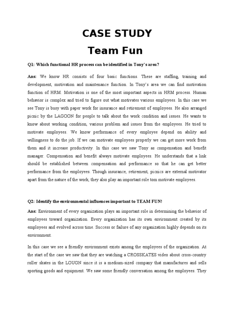 Q2: Identify the environmental influences important to TEAM FUN! Ans: Environment of every organization plays an important role in determining the behavior of employees toward organization. Every organization has its own environment created by its employees and evolved across time. Success or failure of any organization highly depends on its environment. In this case we see a friendly environment exists among the employees of the organization. At the start of the case we saw that they are watching a CROSSKATES video about cross-country roller skates in the LOUGN since it is a medium-sized company that manufactures and sells sporting goods and equipment. We saw some friendly conversation among the employees. They