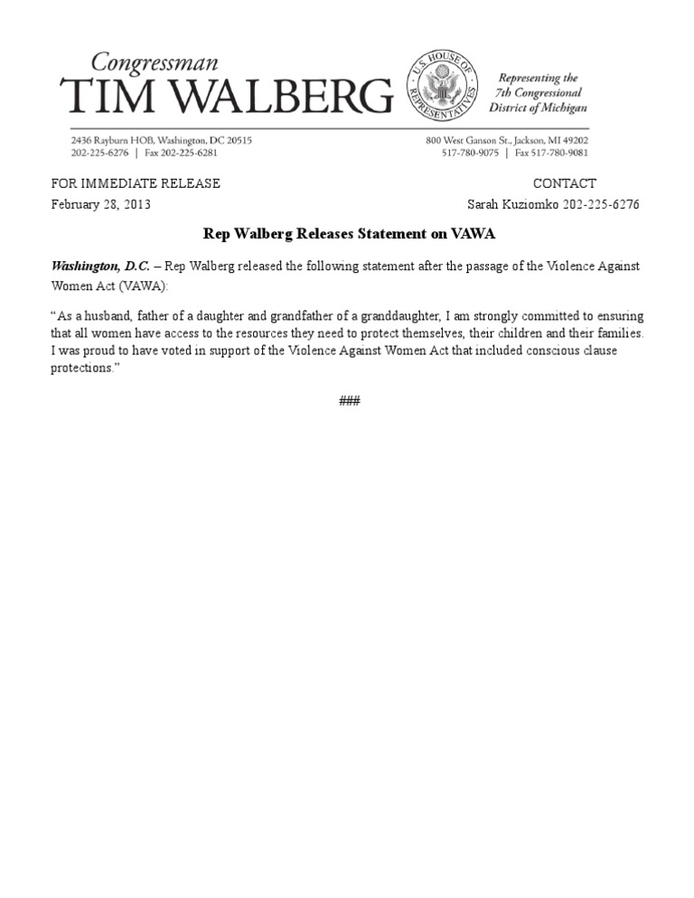 Rep Walberg Releases Statement on VAWA