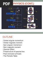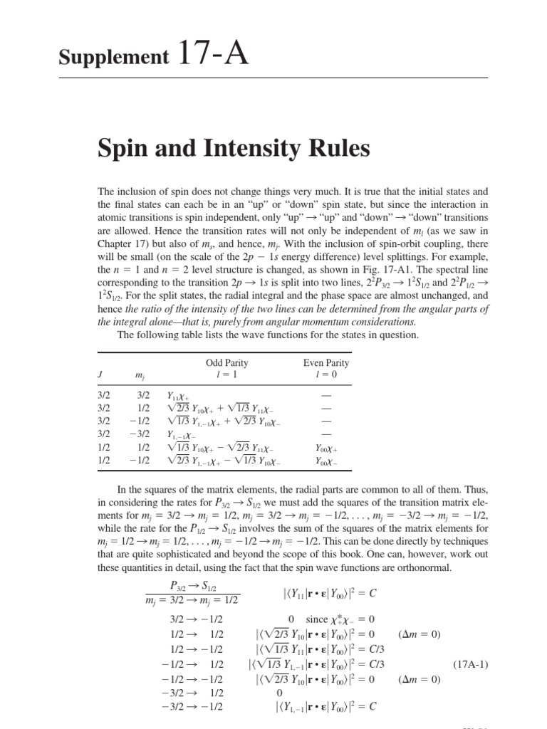 The inclusion of spin does not change things very much. It is true that the initial states and the nal states can each be in an up or down spin state, but since the interaction in atomic transitions is spin independent, only up l up and down l down transitions are allowed. Hence the transition rates will not only be independent of ml (as we saw in Chapter 17) but also of ms, and hence, mj. With the inclusion of spin-orbit coupling, there will be small (on the scale of the 2p 1s energy difference) level splittings. For example, the n 1 and n 2 level structure is changed, as shown in Fig. 17-A1. The spectral line corresponding to the transition 2p l 1s is split into two lines, 22P3/2 l 12S1/2 and 22P1/2 l 12S1/2. For the split states, the radial integral and the phase space are almost unchanged, and hence the ratio of the intensity of the two lines can be determined from the angular parts of the integral alonethat is, purely from angular momentum considerations. The following table lists the wave functions for the states in question.