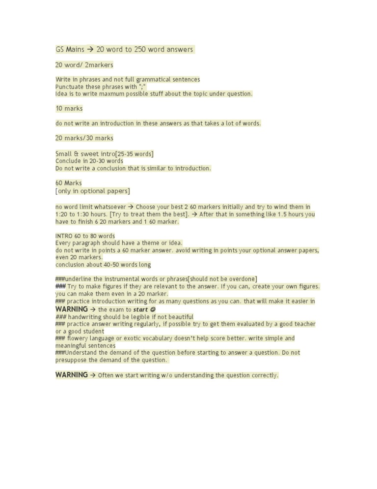 no word limit whatsoever Choose your best 2 60 markers initially and try to wind them in 1:20 to 1:30 hours. [Try to treat them the best]. After that in something like 1.5 hours you have to finish 6 20 markers and 1 60 marker. INTRO 60 to 80 words Every paragraph should have a theme or idea. do not write in points a 60 marker answer. avoid writing in points your optional answer papers, even 20 markers. conclusion about 40-50 words long ###underline the instrumental words or phrases[should not be overdone] ### Try to make figures if they are relevant to the answer. If you can, create your own figures. you can make them even in a 20 marker. ### practice introduction writing for as many questions as you can. that will make it easier in WARNING the exam to start ### handwriting should be legible if not beautiful ### practice answer writing regularly, if possible try to get them evaluated by a good teacher or a good student ### flowery language or exotic vocabulary doesnt help score better. write simple and meaningful sentences ###Understand the demand of the question before starting to answer a question. Do not presuppose the demand of the question.