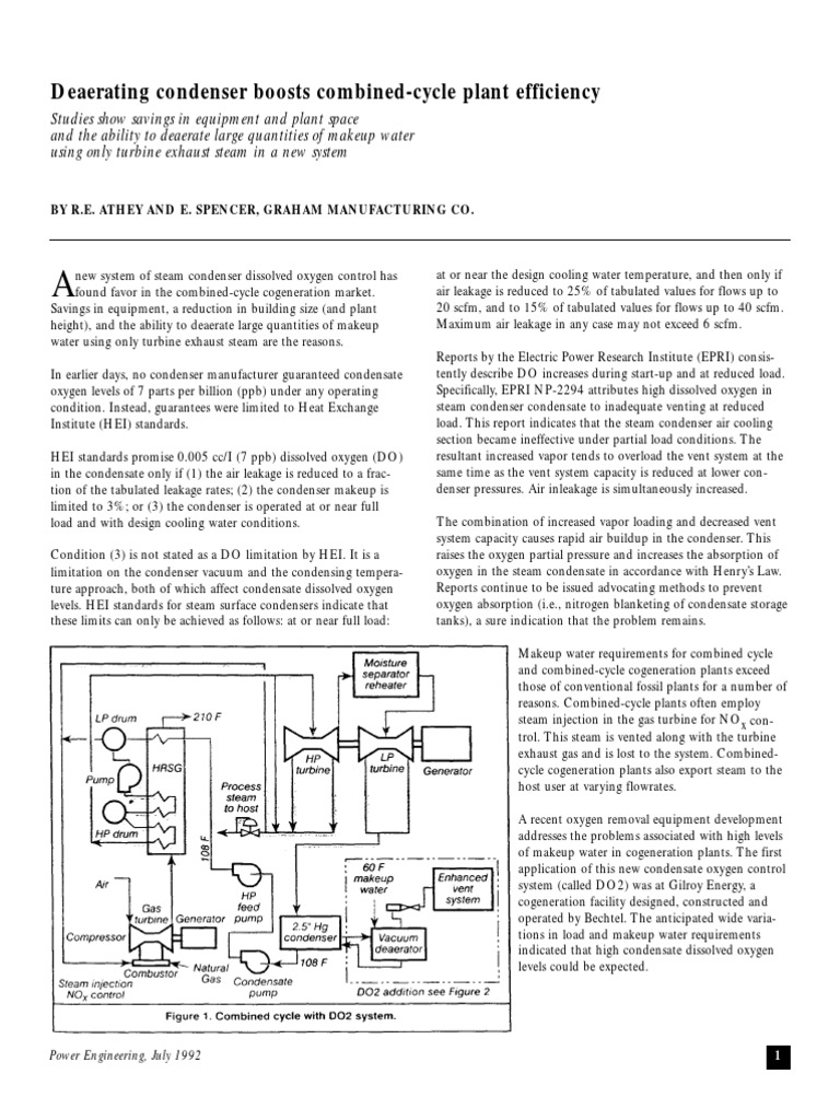 BECHTEL PROJECT BACKGROUND Bechtel completed the Gilroy facility in early 1988. The new condensate oxygen control system provided cold deaerated water containing less than 7 ppb of oxygen to the heat recovery steam generator (HRSG) using only waste turbine exhaust steam for the deaeration of large quantities of highly oxygenated makeup water. Condensate dissolved oxygen levels seldom exceed 5 ppb here despite operating conditions far in excess of the limitations specified in the HEI standards. These conditions also exceeded those reported by EPRI, wherein high dissolved oxygen developed in boiler feedwater in conventional power plants. The simplified combined cycle that resulted from the new system (Figure 1) reduced plant costs, increased power, and improved efficiency. It eliminated equipment, which led to reduced maintenance and improved plant reliability. Space and structural savings also were achieved. Combined-cycle power plants that use clean fuels can achieve maximum efficiency when HRSG discharge temperatures are lowered to near 200 F, rather than the 300 F range which must be maintained when using fuels having acid dew points below 300 F. This difference could result in about a 10% increase in gas turbine exhaust heat recovery. Colder feedwater temperatures than those available from pressure deaerators attain a lower HRSG discharge temperature. It is essential that this feedwater be thoroughly deaerated to 7 ppb of oxygen to prevent corrosion. Because HRSG exhaust temperatures in the 200 F range are above