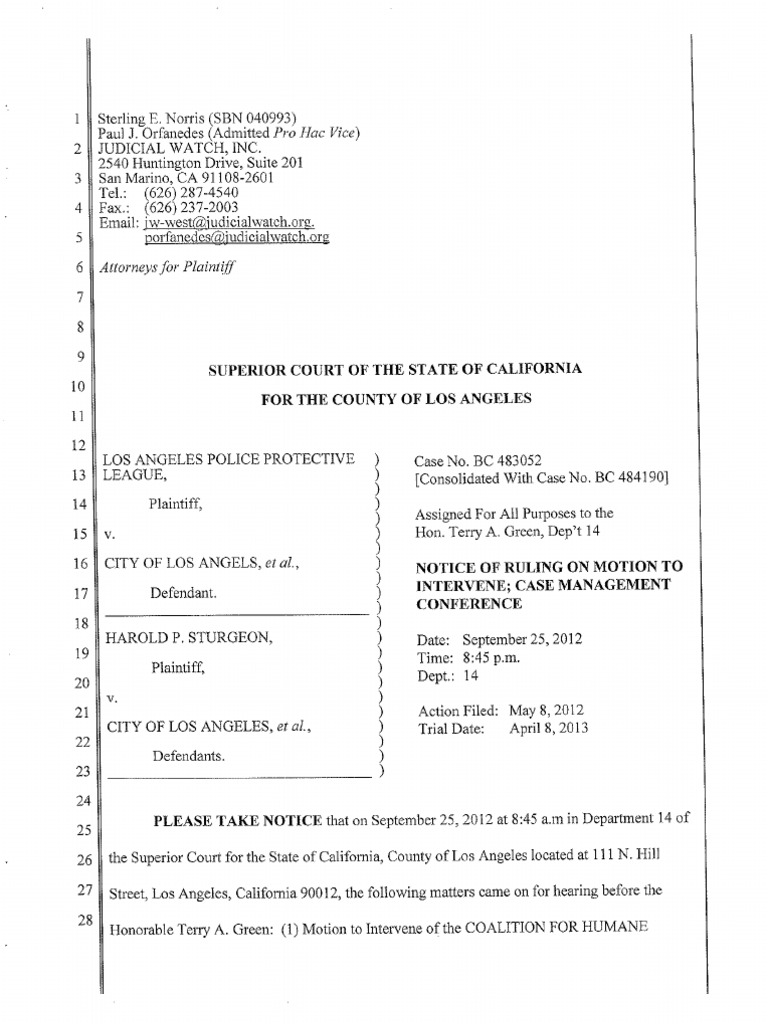 Los Angeles Superior Court’s Notice of Ruling on Motion to Intervene; Case Management Conference - Ruling allowing LA Voice & CHIRLA to intervene in the consolidated suits.