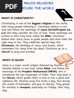 Worlds biggest religion with 2 billion adherents Believe that Jesus Christ is the son of god Worship in churches Spiritual leaders called priests Holy book is the Bible Holy days- Easter and Christmas