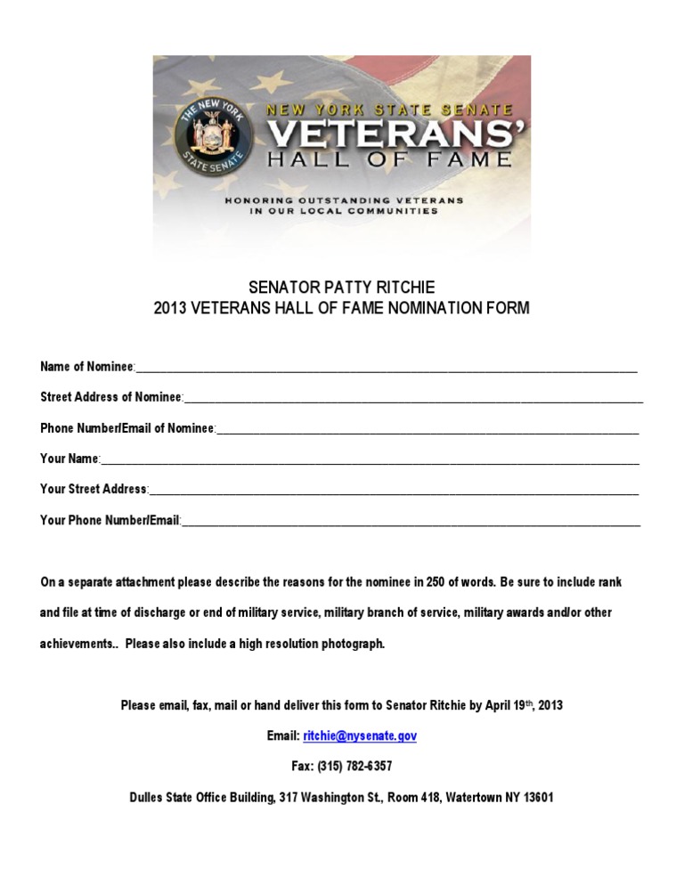 State Senator Patty Ritchie is now inviting people in Oswego, Jefferson and St. Lawrence Counties to nominate veterans for the State Senate's 2013 Veterans' Hall of Fame program.