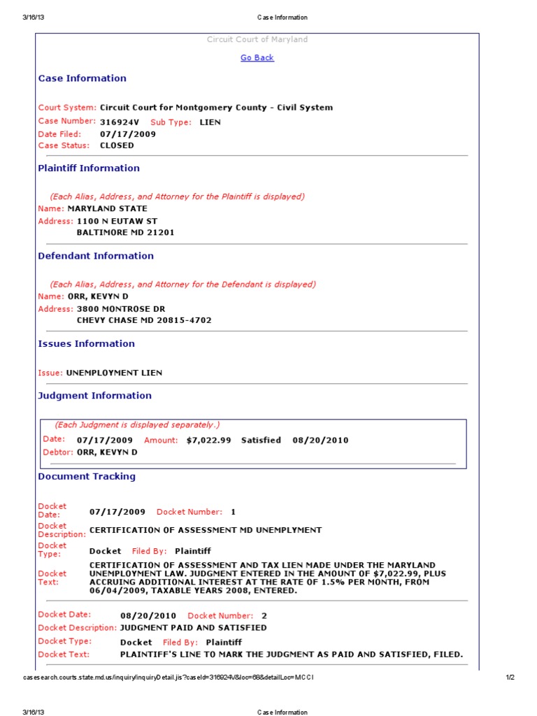 Detroit Emergency Manager Kevyn Orr's state of Maryland tax lien from 2009.