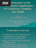 disability, rehabilitation, community care, insurance, social security, employment, education, economics, social policy, legislation and environmental design and modification. Tools to get started An online browser [http://www.who.int/classifications/icfbrowser] includes all ICF codes and definitions in six languages as well as the ICF-CY. The ICF: an overview [http://www.who.int/classifications/icf/icfapptraining/ en/index.html] is an introduction to the ICF available from the WHO website. The Training Manual on Disability Statistics [www.unescap.org/stat/disability/manual/index.asp ] describes the use of the ICF in surveys, censuses and administrative data collections. An interactive web-based education course [http://p.ideaday.de/104.2/icf/] introduces users to the ICF, provides examples and exercises to test your knowledge about the ICF. The WHO-DAS 2 [http://www.who.int/classifications/icf/whodasii/en/in dex.html] is available in short (12 item) and longer (36 item) versions for both self-report and interview administration. For more information http://www.who.int/classifications/icf/en/ or email icf@who.int This document has been produced by the WHO Family of International Classifications Network [http://www.who.int/classifications/en/].