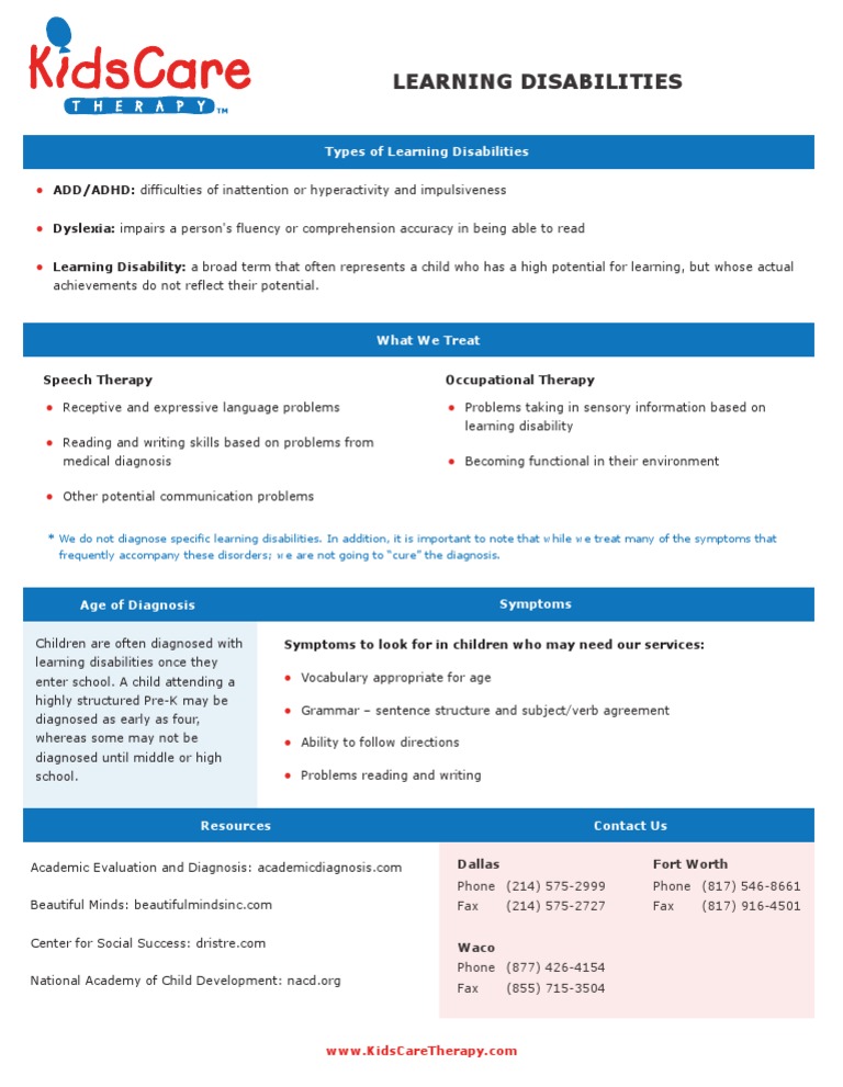 * We do not diagnose specific learning disabilities. In addition, it is important to note that while we treat many of the symptoms that frequently accompany these disorders; we are not going to cure the diagnosis.