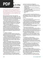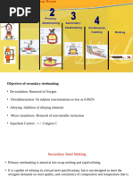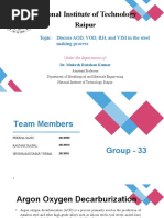 2. stream degassing processes 3. circulation gegassing processes (DH and RH) As stated in Chapter I, an additional temperature drop of 20 to 40c occurs during secondary processing of liquid steel. Temperature control is very important for proper casting, especially continuous casting. Therefore, provisions for heating and temperature adjustment during secondary steelmaking are very desirable. Tn vacuum processing, a successful commercial development in the decade of the 1960s was vacuum arc degassing (VAD), where arc heating is undertaken. Provision for healing is provided in an RH degasser as well. Stainless steels contain a high percentage of chromium. A cheap source of Cr is high-carbon ferrochrome. However, its addition raises the carbon content of the melt to about I%, which is to be lowered to less than 0.03% in subsequent processing. Oxygen lancing bas already been found to promote C-0 reaction in preference to Cr-0 reaction, and it has been practiced commercially. The use of a vacuum is of further help and led to the development of vacuum-oxygen decarburization (VOD) process for stainless steels in the decade of tbe 1960s. Some oxygen blowing is nowadays resorted to in vacuum degassers for the production of ultra-low carbon steels as well. The RH-OB process is an example. Tn vacuum degassing, the total pressure in the chamber is lowered, whereas, in degassing by argon purging, the total pressure above the melt is essentially atmospheric. Even then, degassin'g is effected. This is because partial pressures of H2, N2, and CO are essentially zero in the incoming argon gas. Therefore, degassing by bubbling argon through the melt without vacuum is possible in principle. But consumption and cost of argon would be high, and the processing time would be lengthy. Hence, it is not practiced for ordinary steels. However, decarburization of stainless steel melts by the orson-oxysen decarburittJtiOII {AOD) process is still popular.