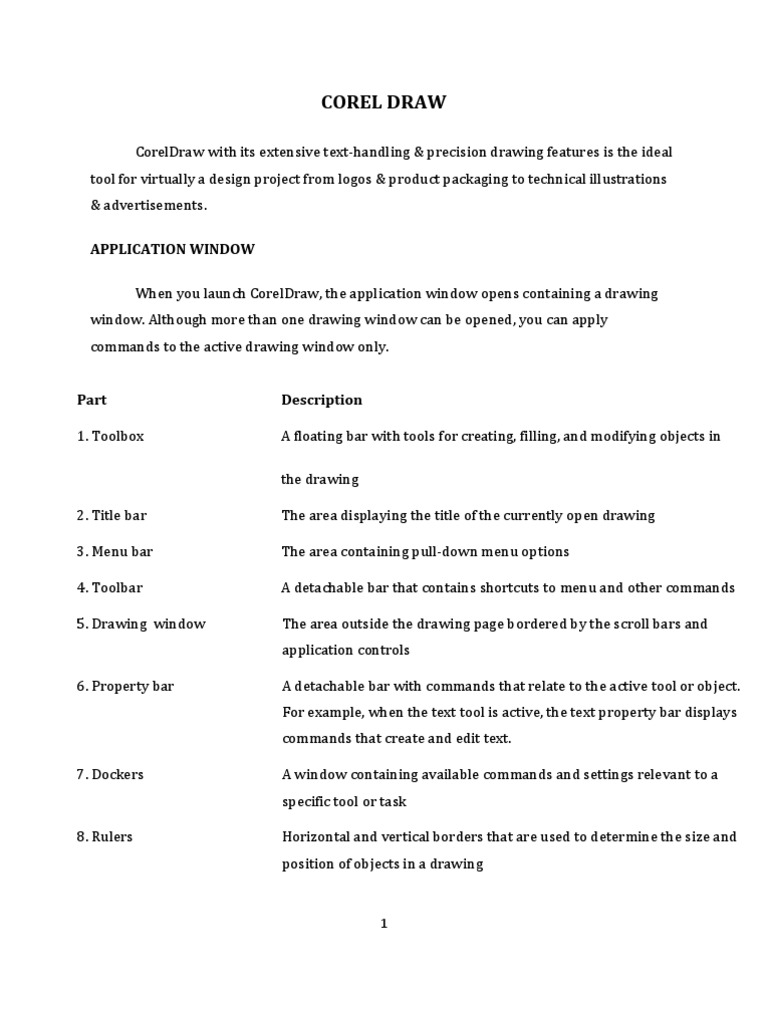 CorelDraw with its extensive text-handling & precision drawing features is the ideal tool for virtually a design project from logos & product packaging to technical illustrations & advertisements. APPLICATION WINDOW When you launch CorelDraw, the application window opens containing a drawing window. Although more than one drawing window can be opened, you can apply commands to the active drawing window only. Part 1. Toolbox Description A floating bar with tools for creating, filling, and modifying objects in the drawing 2. Title bar 3. Menu bar 4. Toolbar 5. Drawing window The area displaying the title of the currently open drawing The area containing pull-down menu options A detachable bar that contains shortcuts to menu and other commands The area outside the drawing page bordered by the scroll bars and application controls 6. Property bar A detachable bar with commands that relate to the active tool or object. For example, when the text tool is active, the text property bar displays commands that create and edit text. 7. Dockers A window containing available commands and settings relevant to a specific tool or task 8. Rulers Horizontal and vertical borders that are used to determine the size and position of objects in a drawing