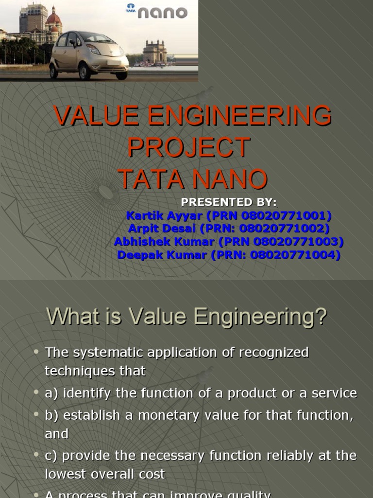 This document summarizes a value engineering project on the Tata Nano vehicle. It provides background on value engineering, describing it as a systematic process to identify unnecessary costs and provide necessary functions at the lowest overall cost without compromising quality. It then discusses the Tata Nano project, describing key details about the vehicle's design, target market of first-time buyers, and Tata's strategies to reduce costs through alternative materials, local sourcing and manufacturing, and supply chain management to achieve a price of 100,000 rupees. The document outlines Tata's approach to value engineering the Nano through alternatives that maintain functionality while minimizing costs.