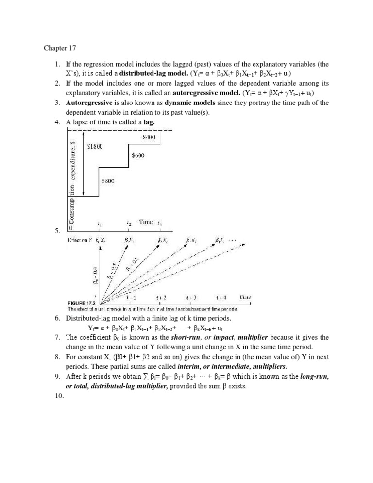 6. Distributed-lag model with a finite lag of k time periods. Yt= + 0Xt+ 1Xt1+ 2Xt2+ + kXtk+ ut 7. The coefficient 0 is known as the short-run, or impact, multiplier because it gives the change in the mean value of Y following a unit change in X in the same time period. 8. For constant X, (0+ 1+ 2 and so on) gives the change in (the mean value of) Y in next periods. These partial sums are called interim, or intermediate, multipliers. 9. After k periods we obtain i= 0+ 1+ 2+ + k= which is known as the long-run, or total, distributed-lag multiplier, provided the sum exists. 10.