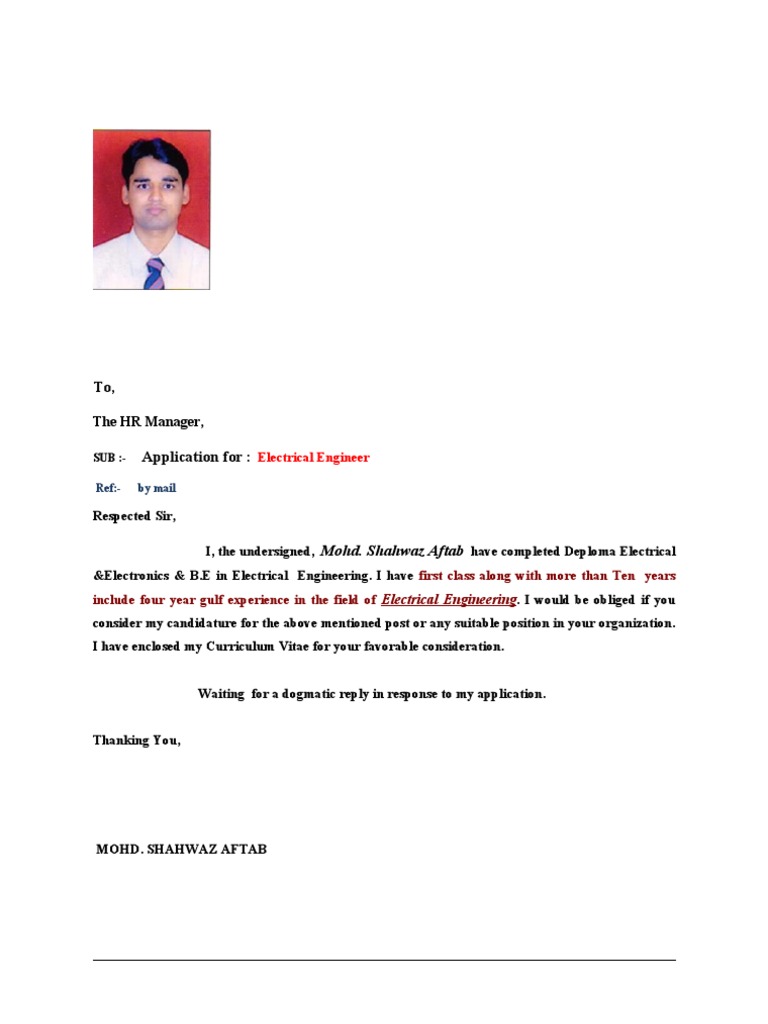 Respected Sir, I, the undersigned, Mohd. Shahwaz Aftab have completed Deploma Electrical &Electronics & B.E in Electrical Engineering. I have first class along with more than Ten years include four year gulf experience in the field of Electrical Engineering. I would be obliged if you consider my candidature for the above mentioned post or any suitable position in your organization. I have enclosed my Curriculum Vitae for your favorable consideration. Waiting for a dogmatic reply in response to my application. Thanking You,