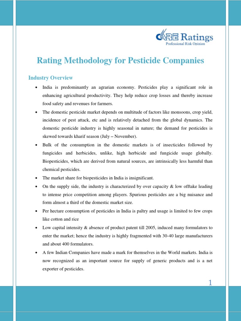 CARE considers both quantitative as well as qualitative factors while rating pesticide companies. Quantitative analysis involves analyzing contribution from various product lines, export presence, operating efficiency etc. Qualitative analysis comprises analyzing the R&D capabilities of the company, number of product registrations, product range, brand-building efforts, etc. Business risk assessment of pesticide companies involves analysis of the following factors: Product Portfolio Operating Efficiency R&D Capabilities Number of Product Registrations /Acquisitions Distribution Network Brand Building & Product Awareness Measures Exports