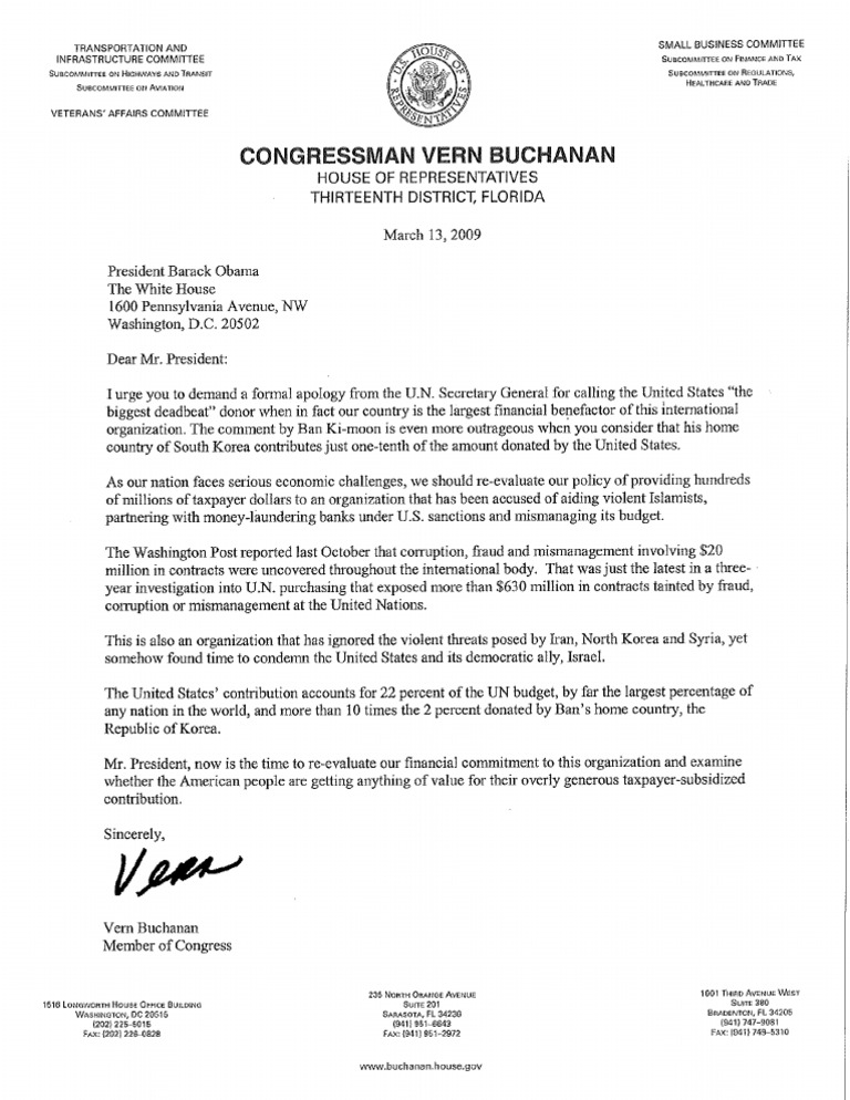 A letter from Rep. Vern Buchanan (FL-13) to President Obama urging him to demand a formal apology from United Nations Secretary General Ban Ki-moon of South Korea. Ban called America “the biggest deadbeat” donor in the world, despite the fact that the United States contributes more to the UN than any other nation.